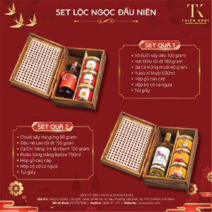 SET QUÀ TẾT TIKO 2522 Set quà gồm: Vỏ Bưởi sấy dẻo 100 gram Mít sấy giòn 60 gram Đậu Hà Lan tỏi ớt 120 gram Hạt Dẻ cười 180 gram Cá Thiều tẩm gia vị 120 gram Trà Hoa lài 40 gram Hộp gỗ cao cấp Hộp lì xì gieo quẻ phát lộc Túi...