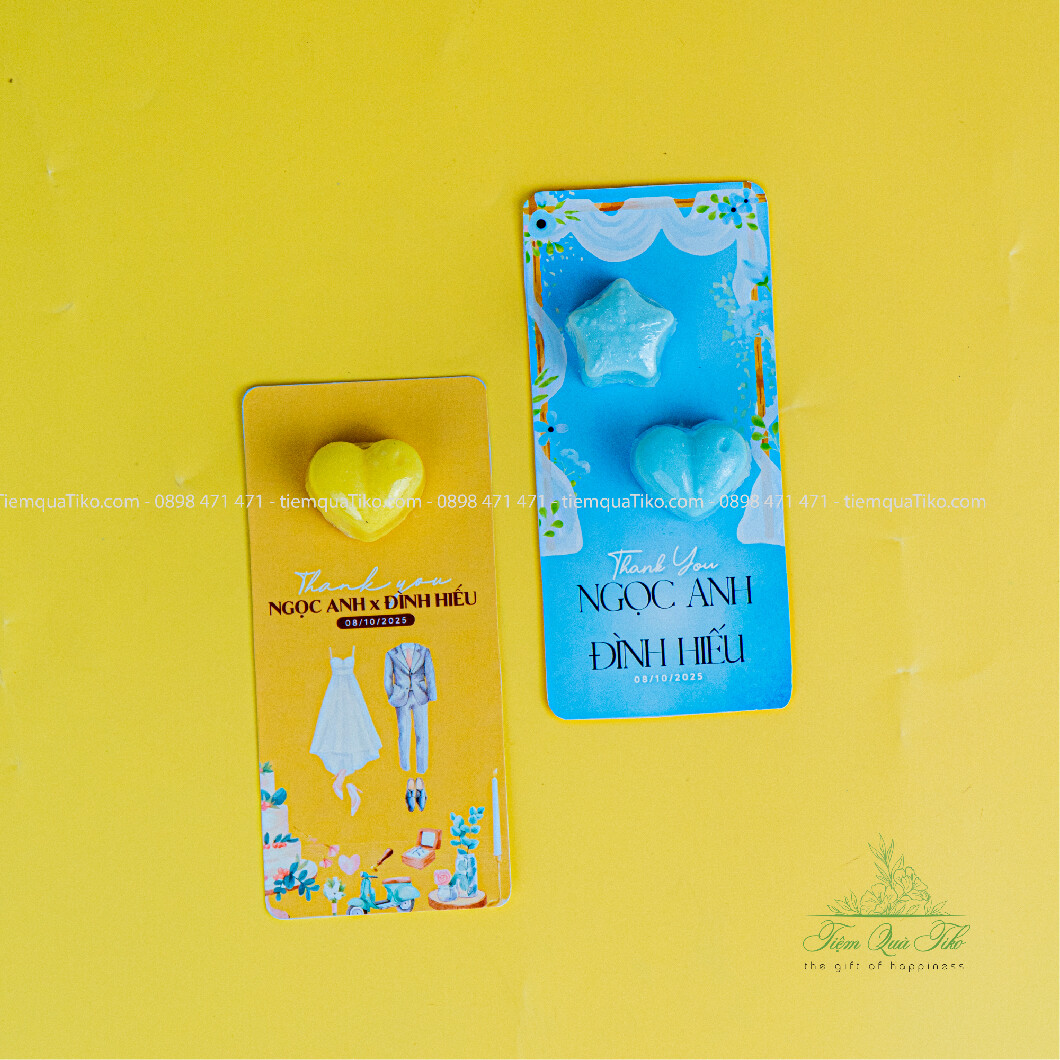 - 2 viên xà phòng được đính kèm thiệp in thông tin theo yêu cầu.