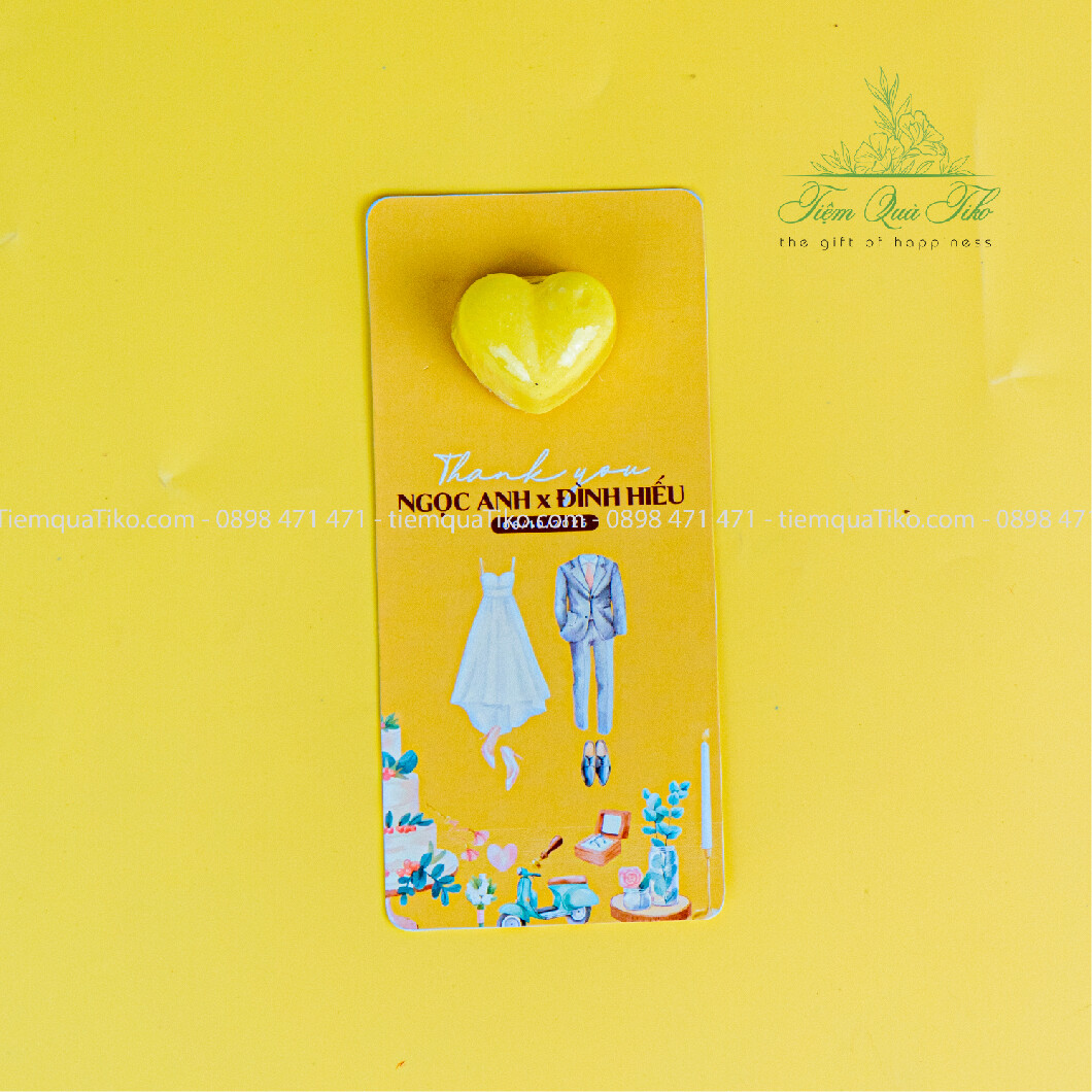- 1 viên xà phòng được đính kèm thiệp in thông tin theo yêu cầu.