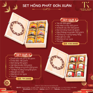 SET QUÀ TẾT TIKO 2527 Set quà gồm: Khô Bò Củ Chi 120 gram Khô Gà lá chanh 80 gram Hạnh nhân rang bơ 180 gram Hạt Dẻ cười 180 gram Xoài sấy dẻo 200 gram Táo đỏ sấy dẻo 120 gram Trà Hoa lài 40 gram Hộp gỗ 2 tầng Hộp lì xì gieo...