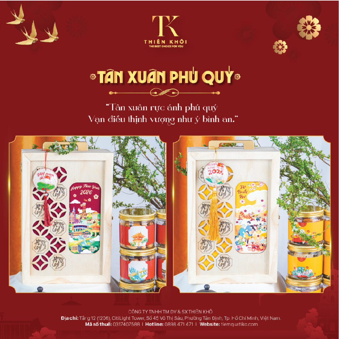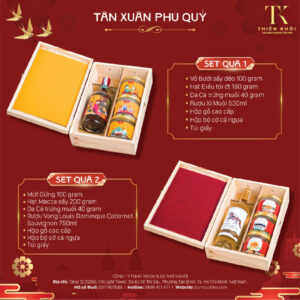 SET QUÀ TẾT TIKO 2526 Set quà gồm: Khô Bò Củ Chi 120 gram Hạt Dẻ cười 180 gram Táo đỏ sấy dẻo 120 gram Hạt Macca sấy 200 gram Thơm muối ớt 200 gram Rượu Hồng liên 530ml Hộp gỗ 2 tầng Hộp lì xì gieo quẻ phát lộc Túi giấy